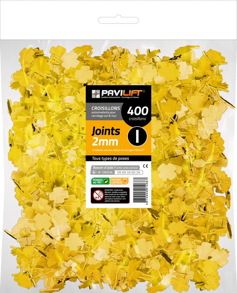 Système révolutionnaire qui d'obtenir une surface parfaitement plane. Croisillons pavilift pour joint de 3 mm carrelage. Selon la taille du carreau de carrelage, on va utiliser plus ou moins de croisillons. Ils sont à la fois pratiques et simples d'utilisation. Vous disposez le croisillon de façon à ce qu'il puisse serrer les deux carreaux voisins.